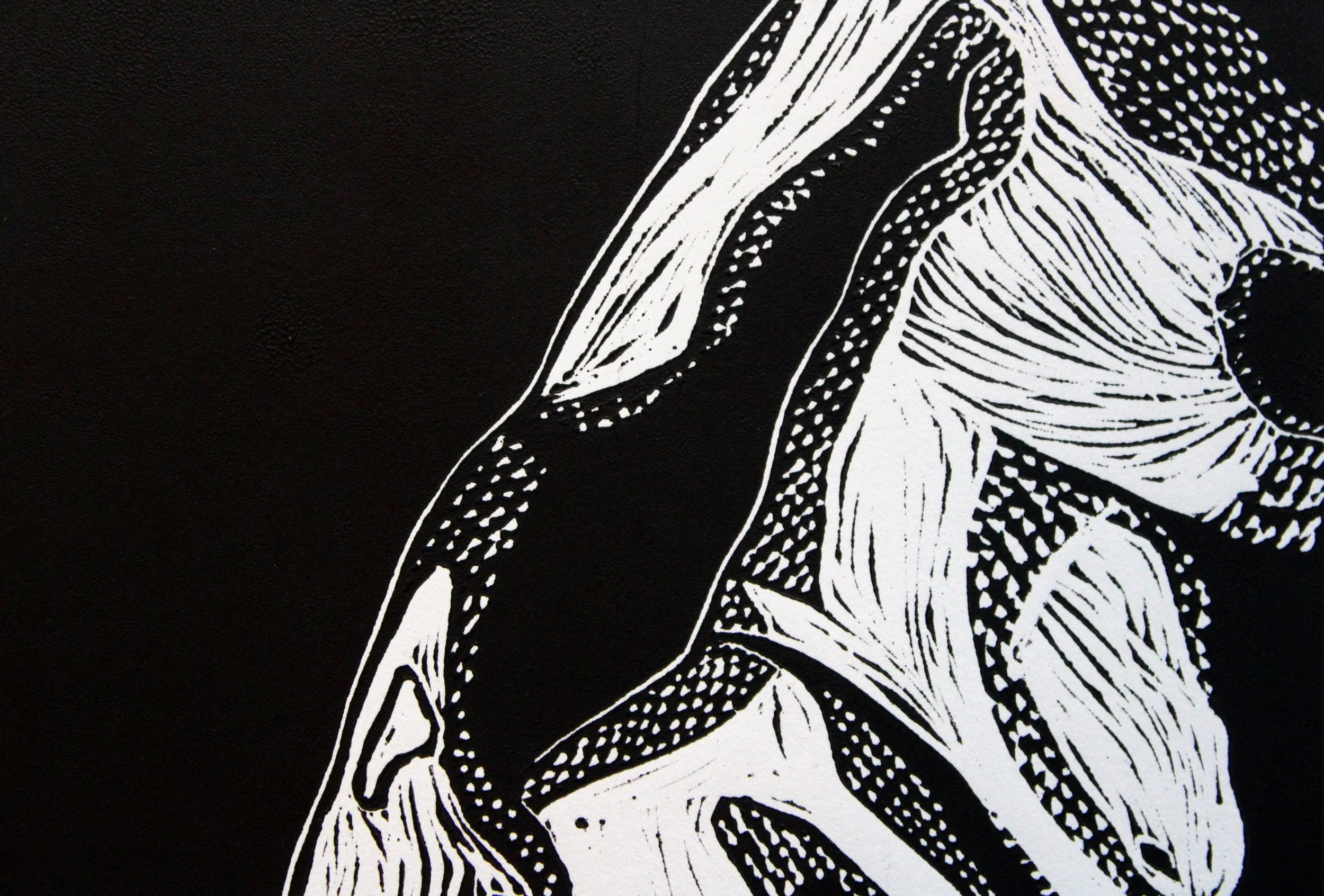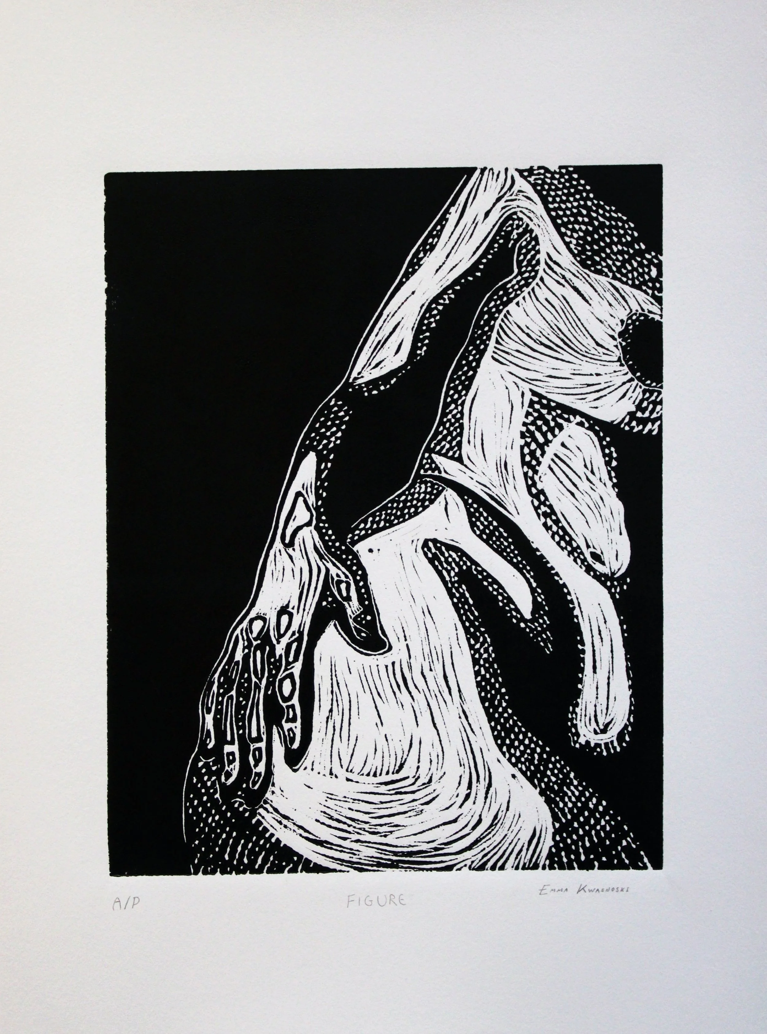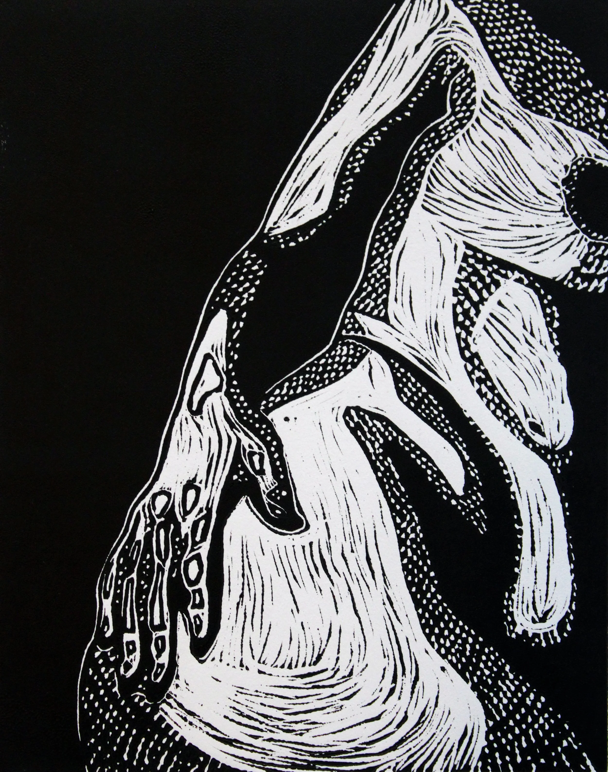 This print is based on some of my figure drawings. It’s part of a series of prints that focuses on hands and exploring how to translate shadow and texture in linocut.